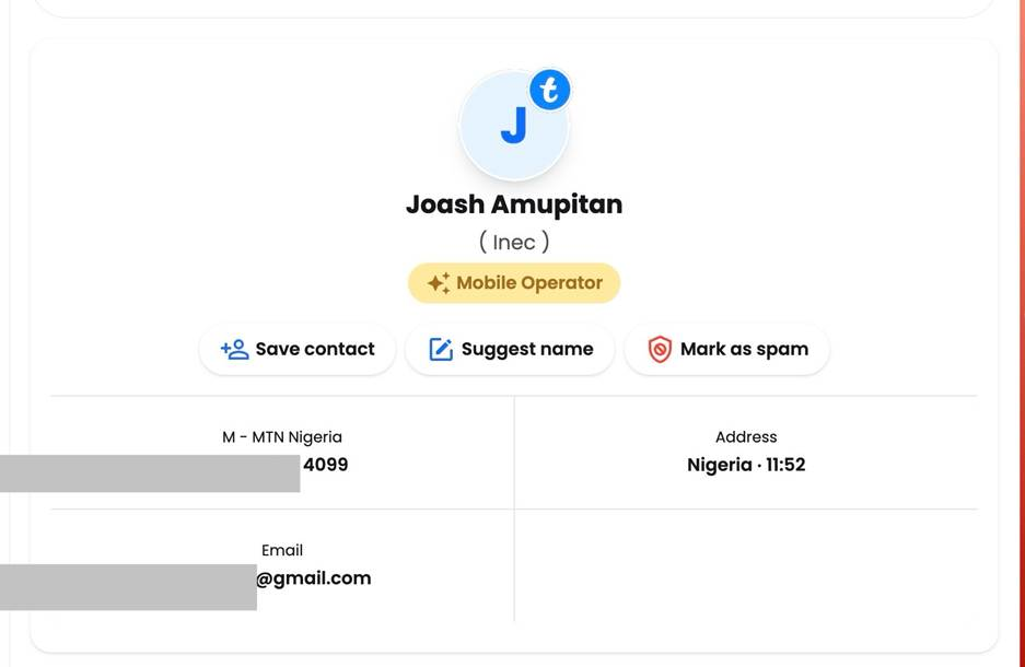 The details are consistent with those being circulated online. We further confirmed that the phone number is linked to him using Truecaller and an Opay account associated with the number. Through True Caller, we further extracted another Gmail account, j***ho@gmail.com, linked to the phone number.